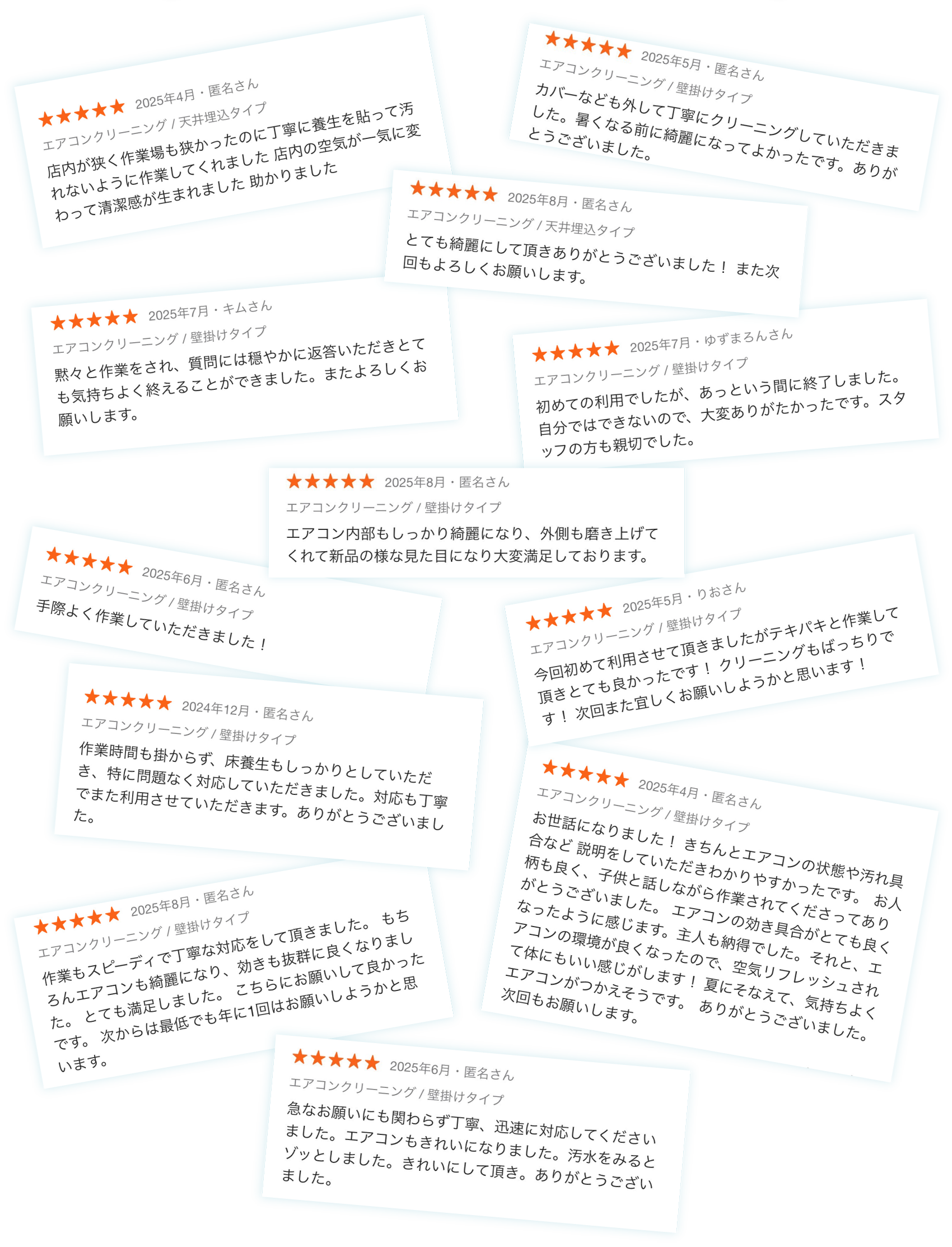エアコン洗浄を行う前には、必ず動作の確認し、少しでも異常がある場合は事前にご報告し、自社修理にも対応致します!また、エアコン周辺が汚れない様、徹底養生を施します。また、洗浄後2週間以内は再施工が無料!とアフターサービスも充実しております!